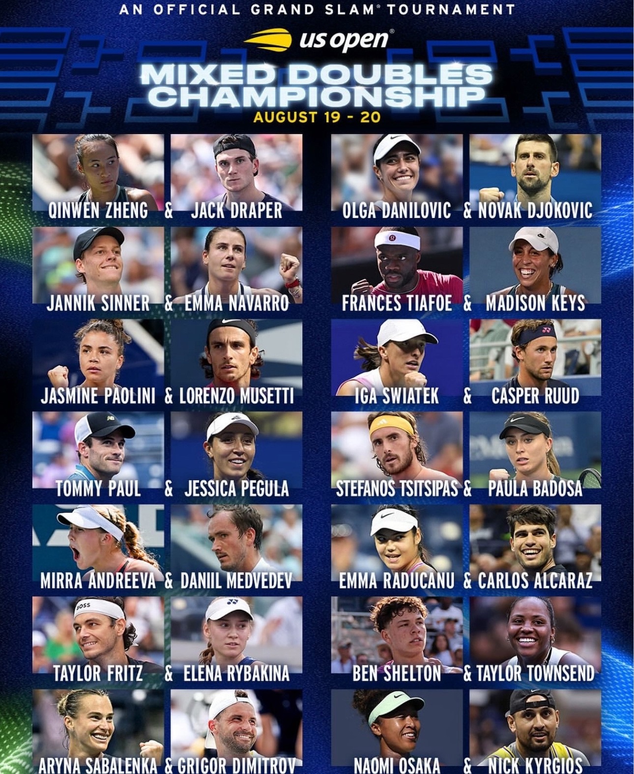 Стало известно, какие пары заявлены на участие в соревнованиях смешанных пар, которые пройдут 19–20 августа — накануне основной сетки. Хотя окончательная заявка будет подтверждена рейтингами по состоянию на 28 июля, список уже пестрит громкими именами и неожиданными дуэтами:
